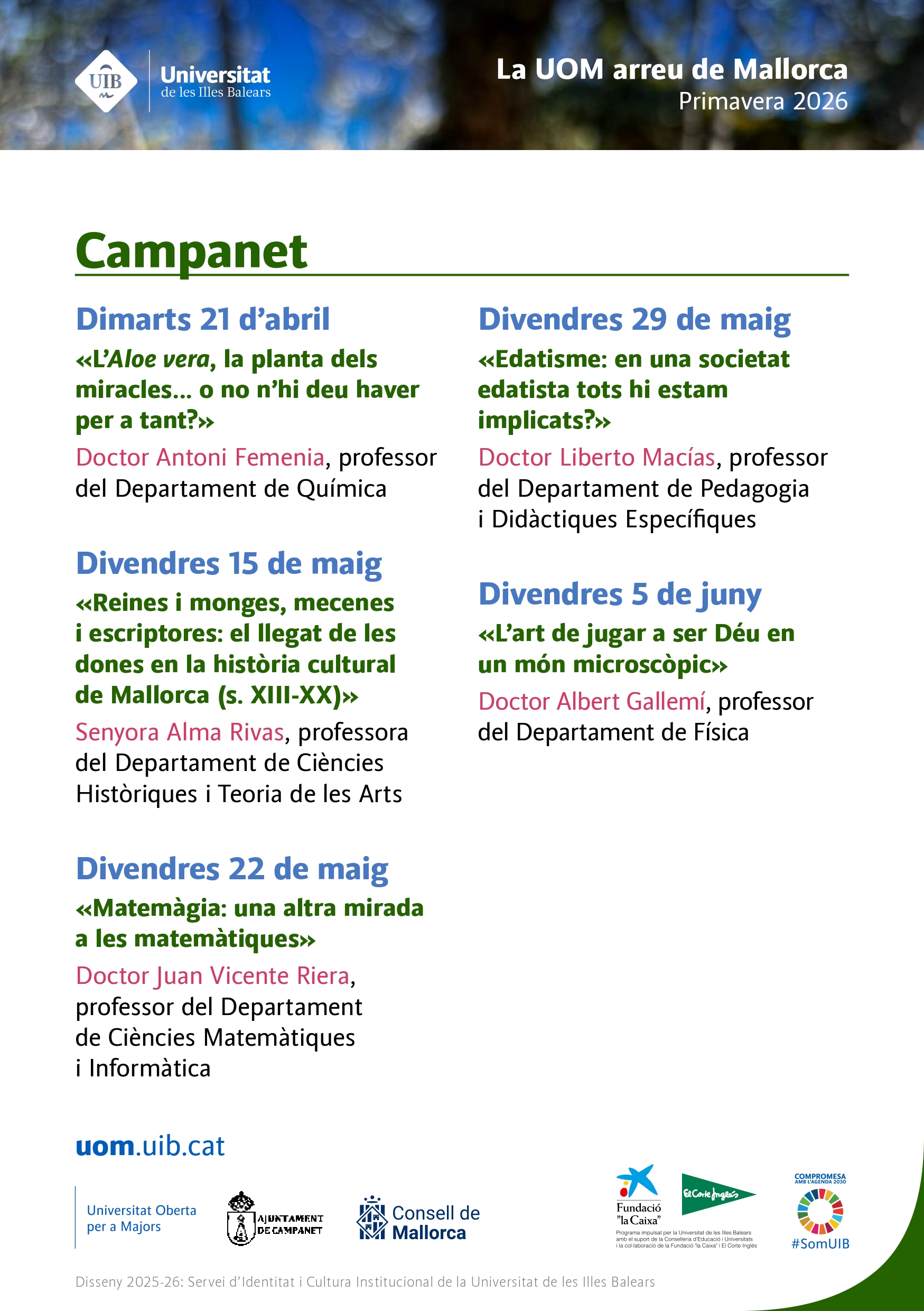 La Universitat Oberta per a Majors de la UIB torna a posar en marxa el seu cicle de conferències arreu de Mallorca, i Campanet torna a ser punt de trobada per aprendre, compartir i gaudir del coneixement.