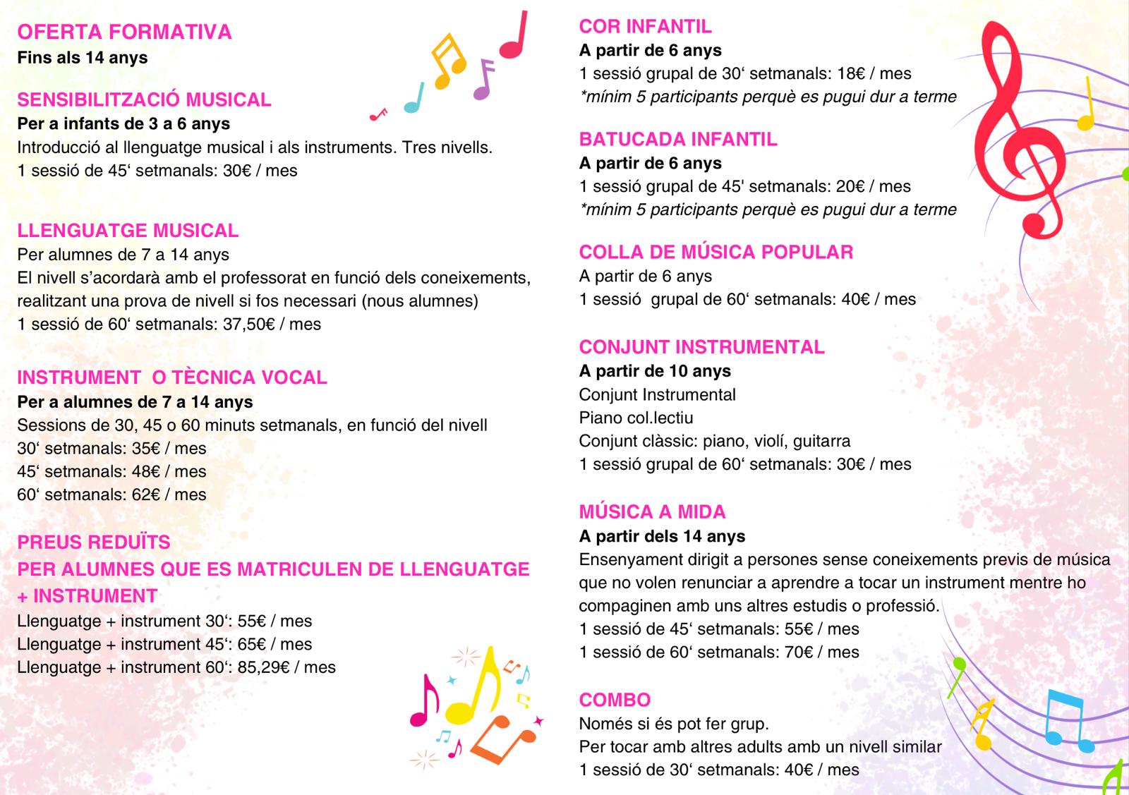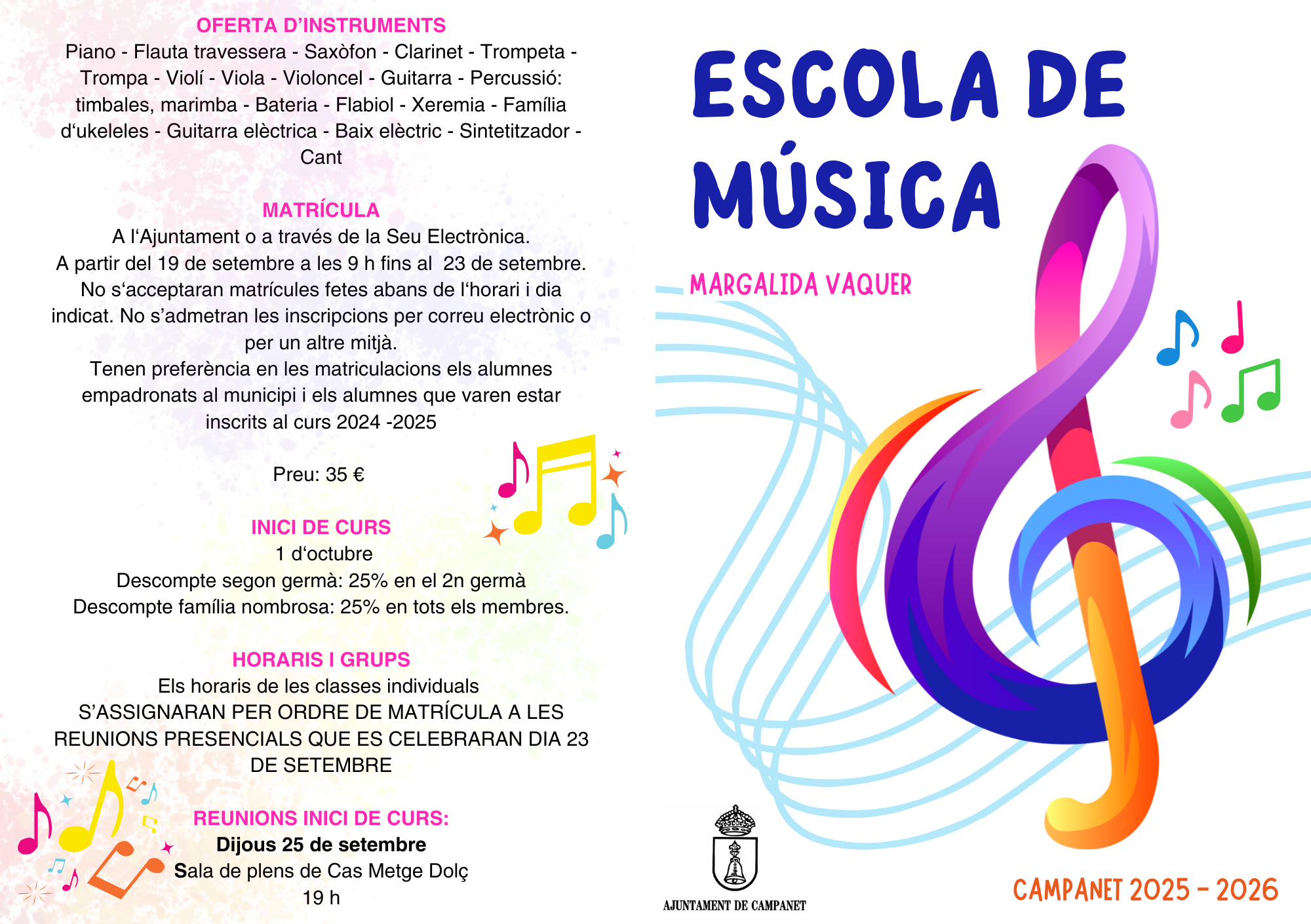 A partir del pròxim DIVENDRES 19 de setembre a les 9 h s'obri el procés de matrícula de l'Escola de Música Margalida Vaquer de manera presencial a l'Ajuntament o a través de la seu electrònica de l'Ajuntament ( https://campanet.sedelectronica.es/info.0 )