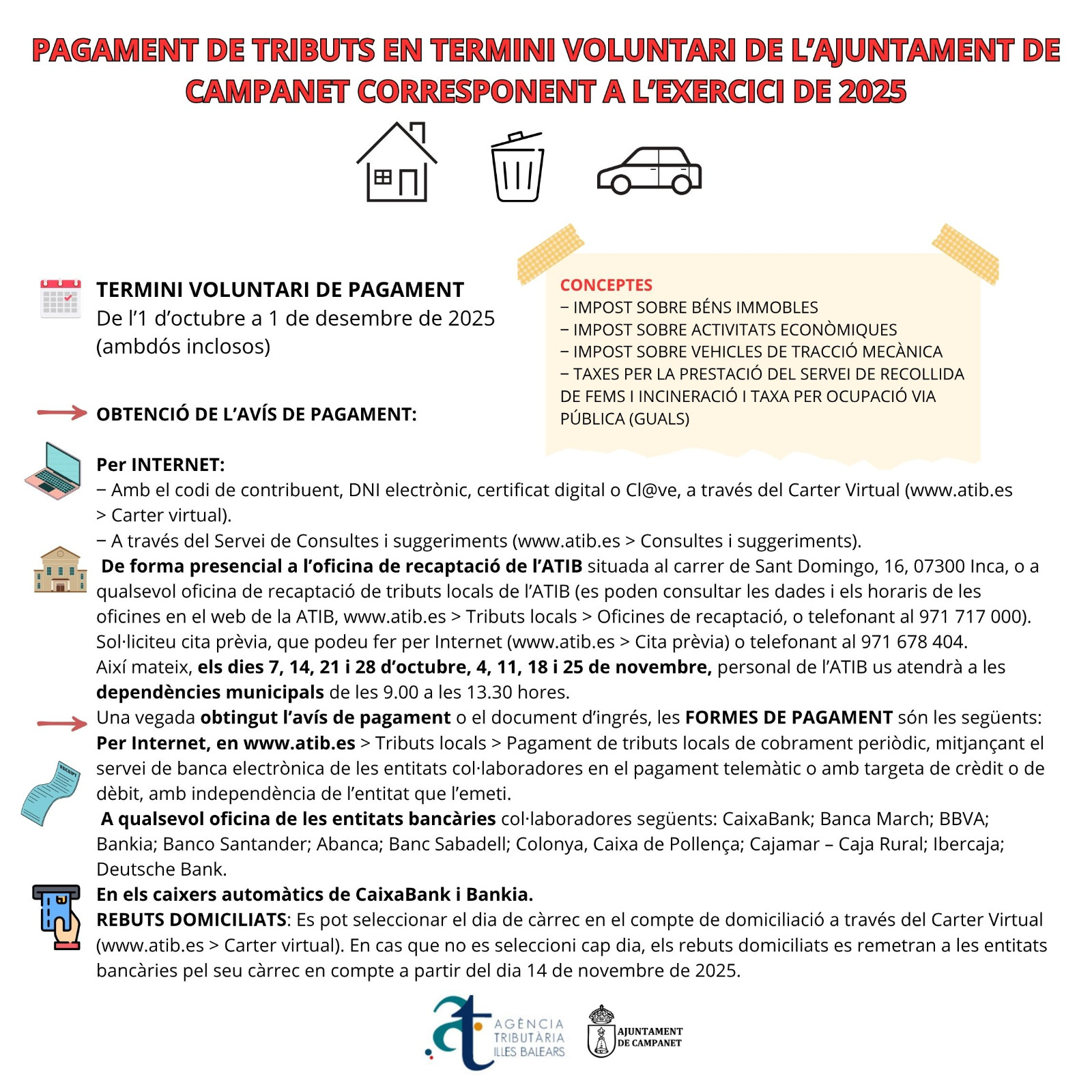PAGAMENT DE TRIBUTS EN TERMINI VOLUNTARI DE L’AJUNTAMENT DE CAMPANET CORRESPONENT A L’EXERCICI DE 2025