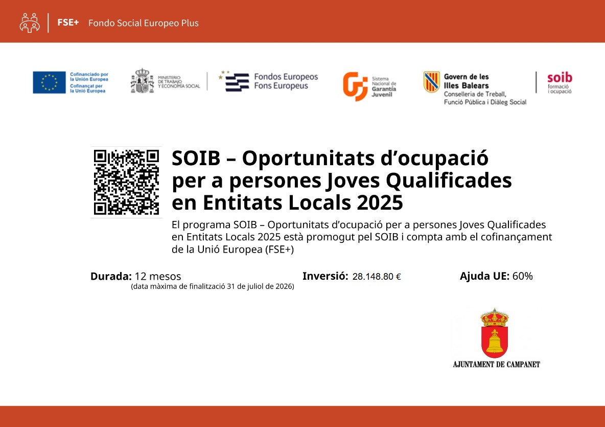 L’Ajuntament de Campanet gràcies al programa SOIB Jove: Qualificats Entitats Locals 2025 incorpora a 1 tècnic superior en educació infantil.